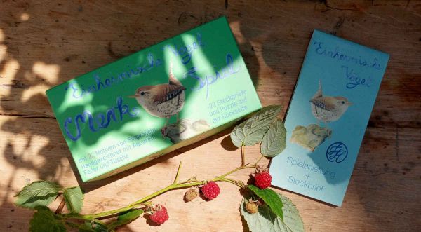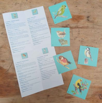 Es gibt 22 Paare mit Singvögeln, die verdeckt auf den Tisch gelegt werden. Der Reihe nach zieht Ihr zwei Karten, wer ein Paar hat, kann den Steckbrief zu diesem Vogel vorlesen und noch zwei Karten aufdecken. Zu jeder Vogelart gibt es einen kleinen, interessanten Steckbrief. Die Rückseiten der Spielkarten sind Puzzleteile und ergeben im Ganzen die schöne Blaumeise als großes Bild.
